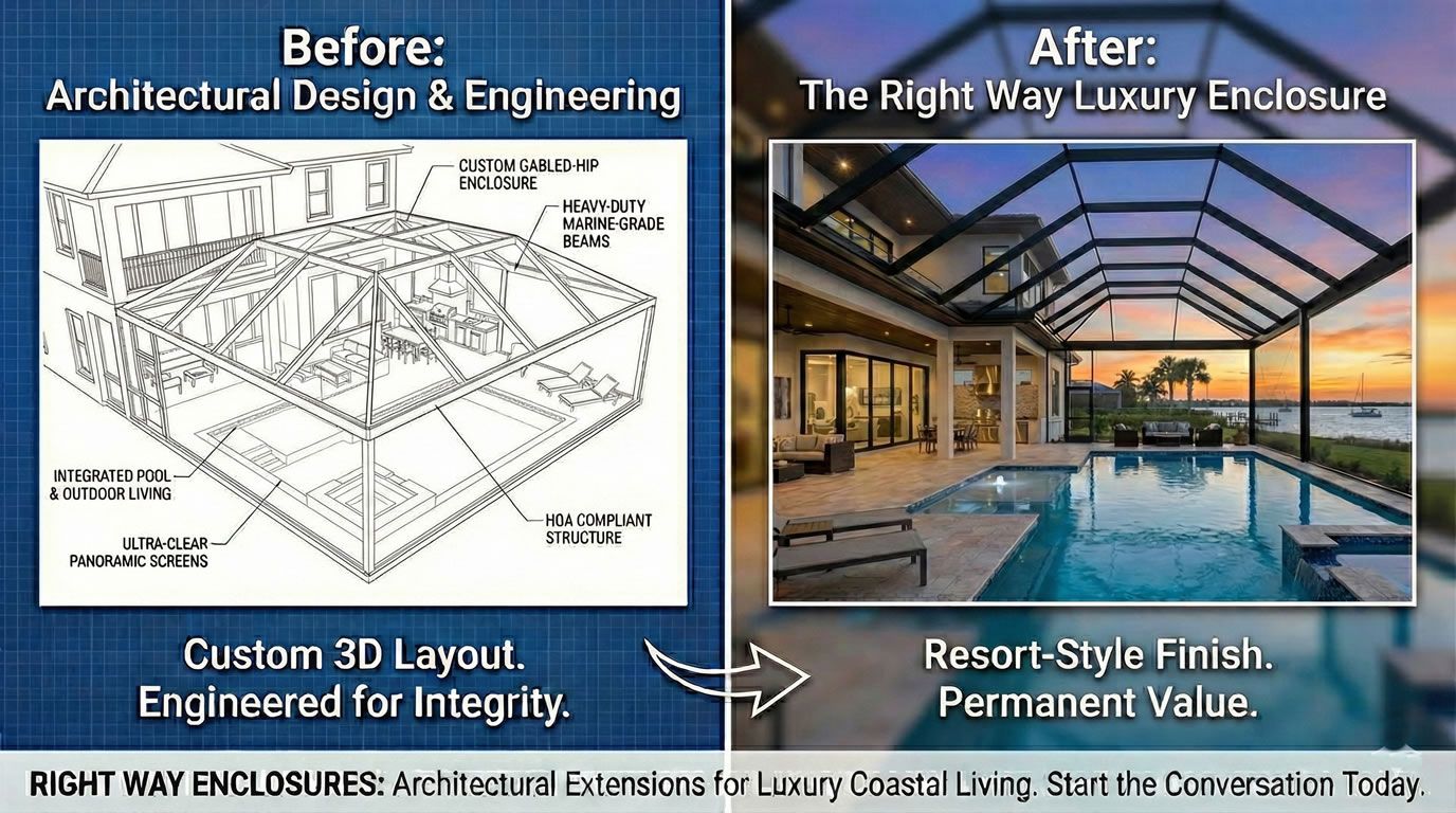 Custom Screen Enclosures: From hurricane-grade framing to high-clarity screen, we build architectural extensions designed for maximum view and minimum hassle.